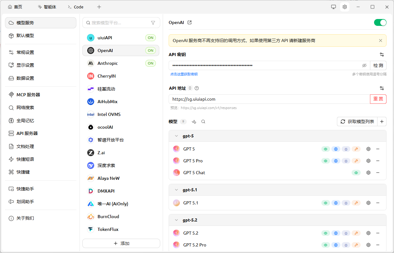 国内开发者或者AI使用的用户接入 [uiuiAPI] 。作为专业的 API 分发,uiuiAPI 完美契合了 Cherry Studio 的多模型调度需求: