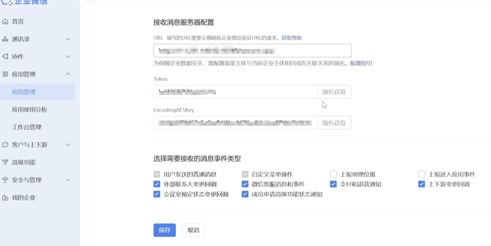 进入应用详情,找到 “接收消息” -> 设置 API 接收。点击随机获取 Token 和 EncodingAESKey(先复制到记事本暂存,不要点保存)。