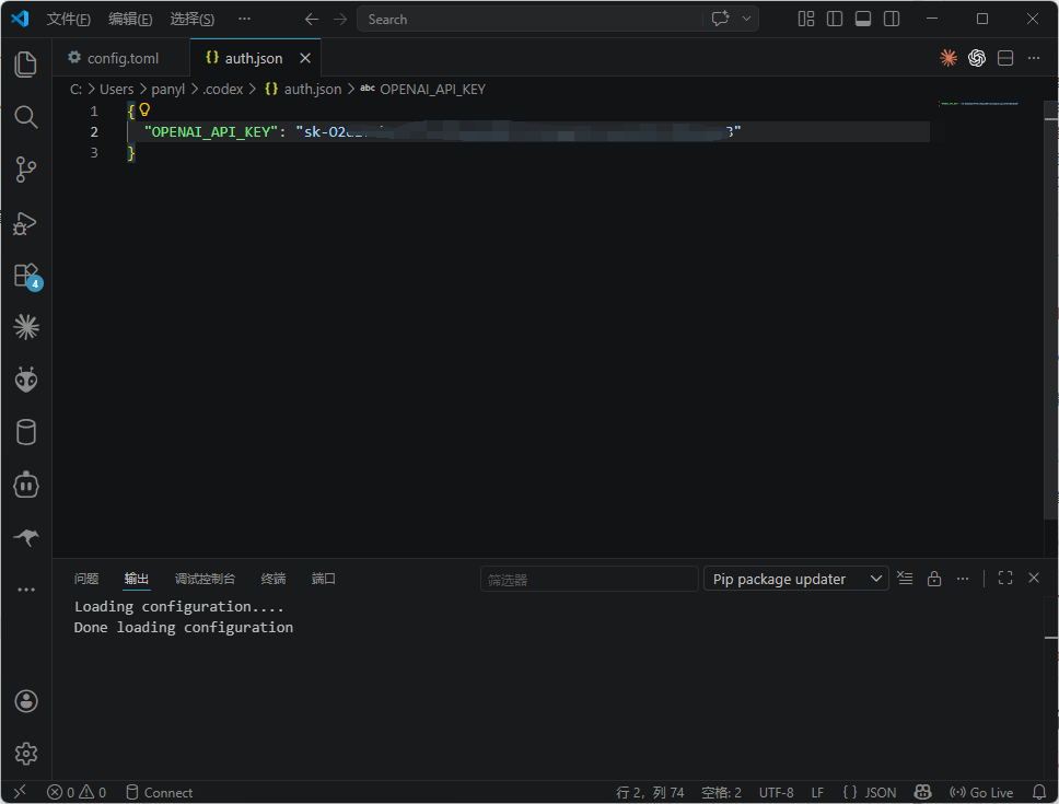 1.文件配置~/.codex/auth.json 配置示例: