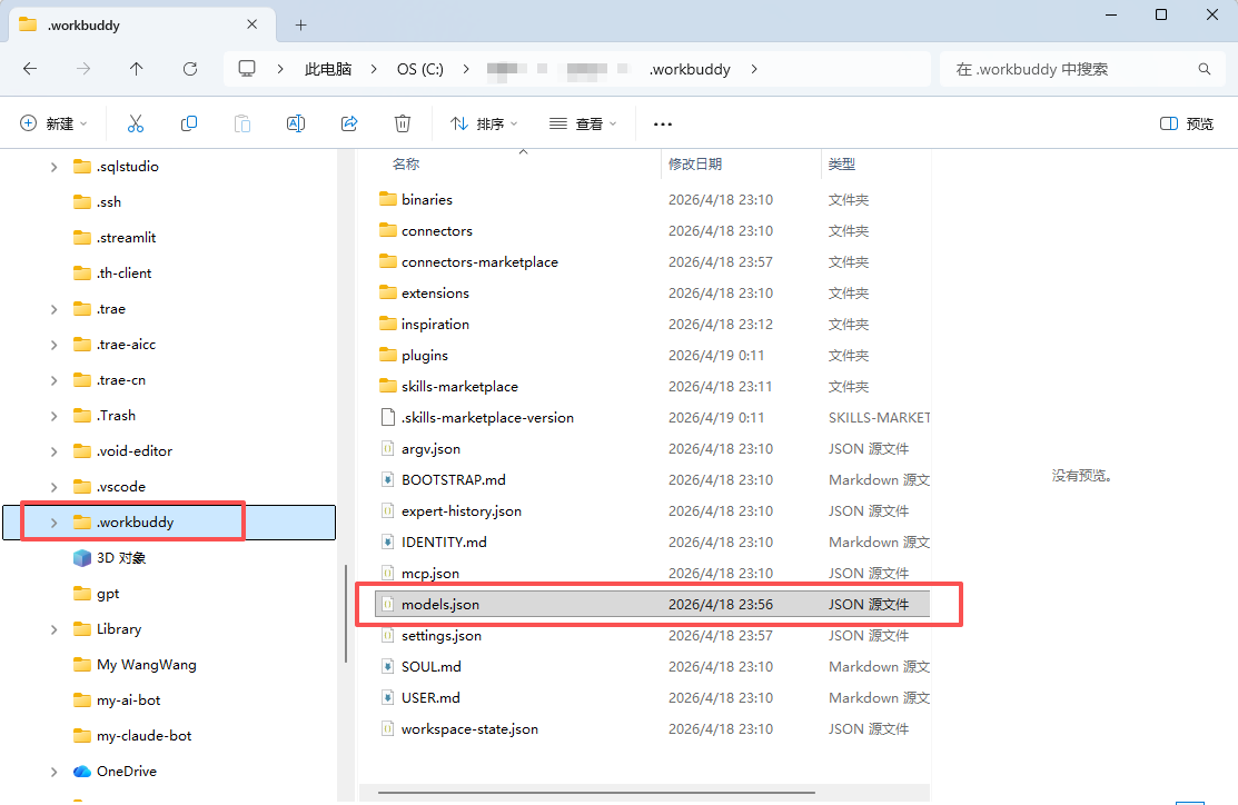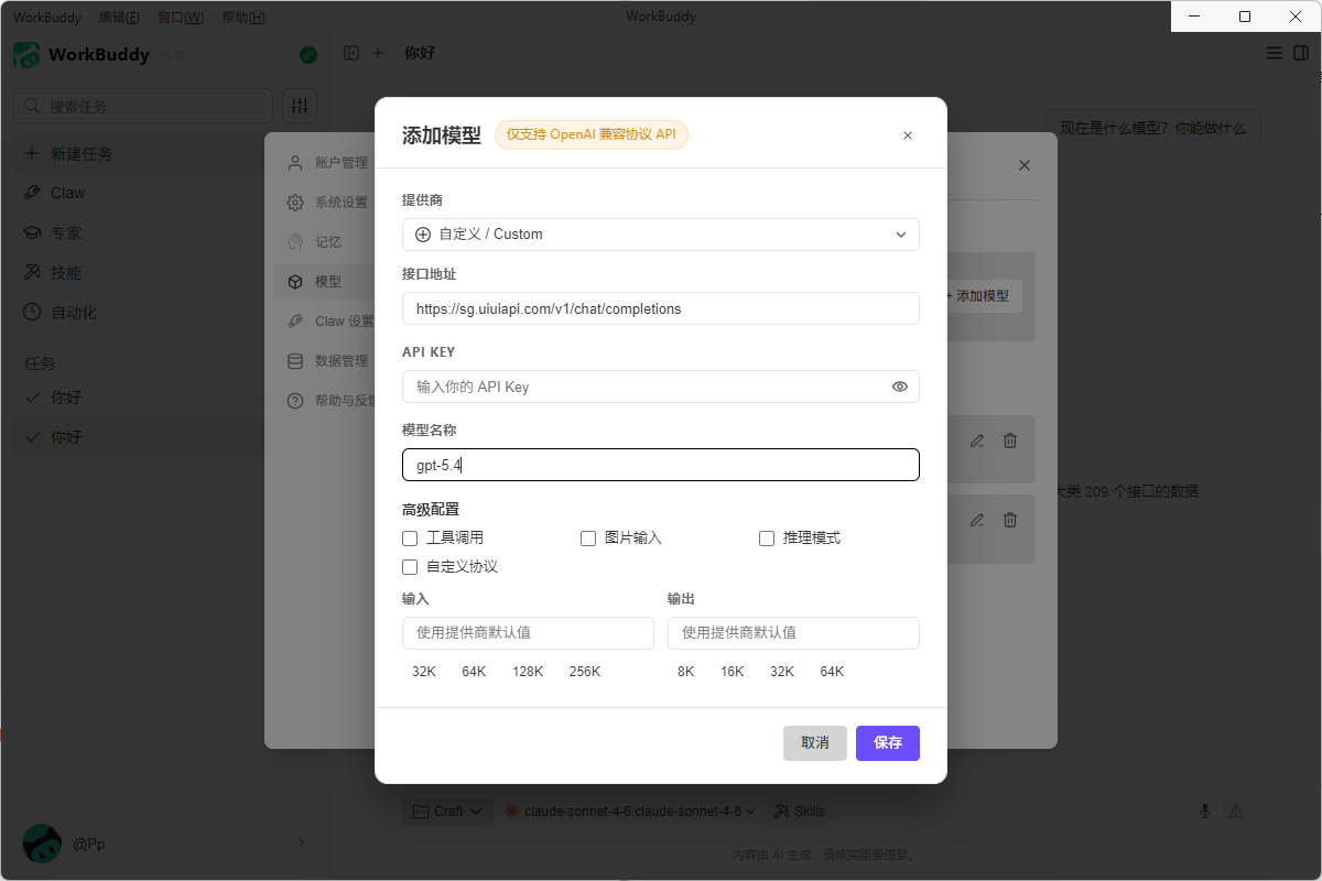 WorkBuddy 核心高阶能力是支持 OpenAI 兼容格式的自定义模型。通过找到安装文件本地配置文件或者安装好WorkBuddy客户端设置模型中配置自定义模型,你可以自由接入任意大模型,实现按任务动态切换。