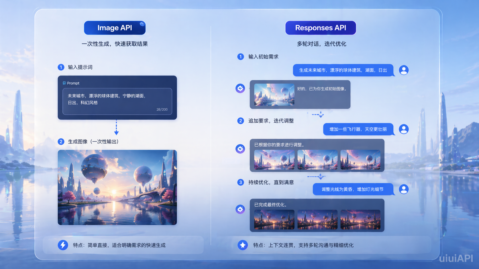 如果你的需求只是“一句话随便出张图”,Images API 足够;如果你要做“先上传图,再让模型多轮修改,再生成最终图”的产品形态,Responses API 更适合。官方文档也明确给了这两个方向的选择建议:单次生成/编辑选 Image API,多轮可编辑体验选 Responses API。